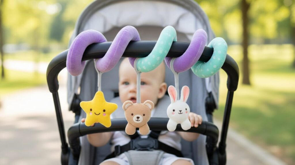 These hanging spiral toys attach easily to strollers with a front handle or car seats, keeping your baby entertained while encouraging brain development with mirrors, teethers, and rattles. Perfect for newborns up to 6 months.